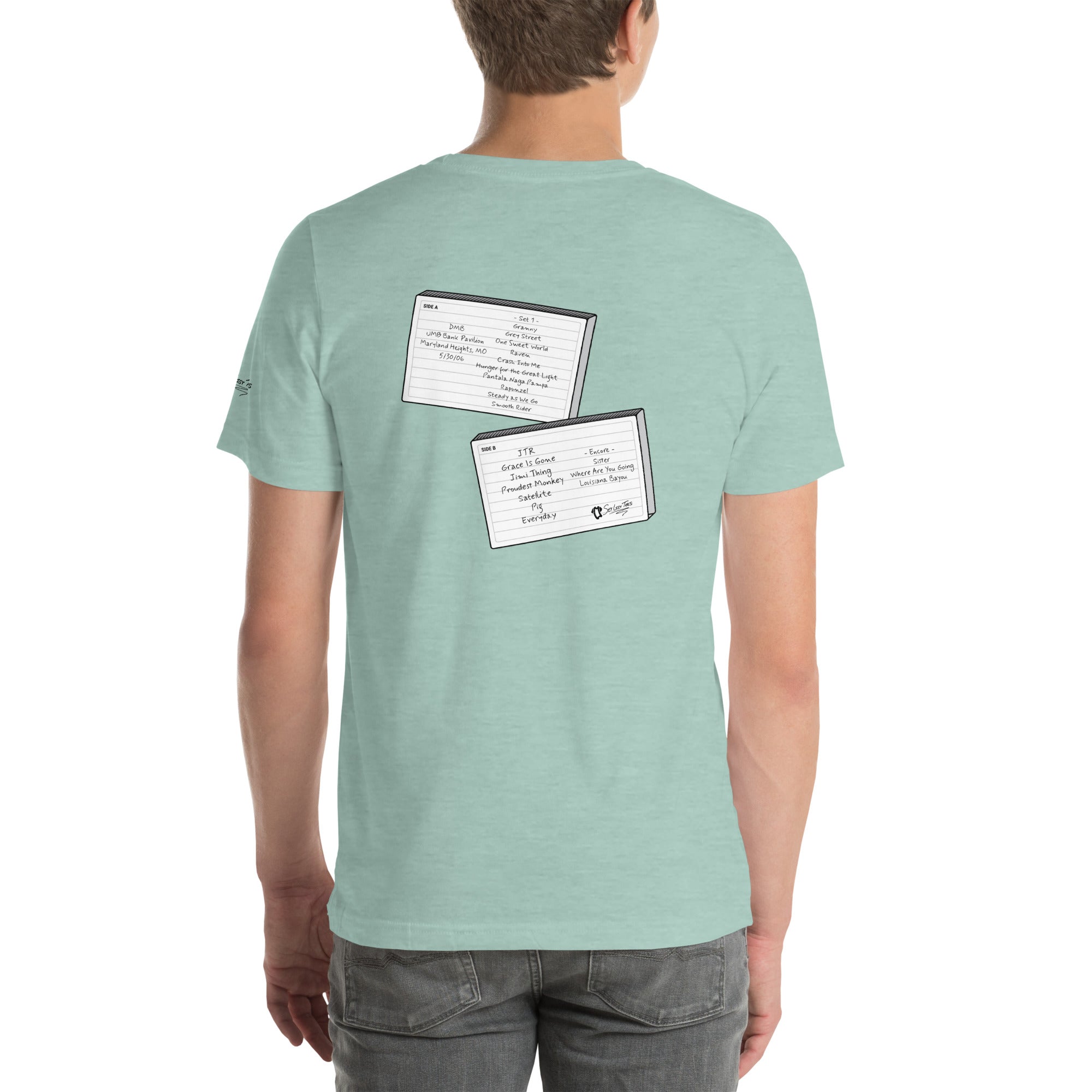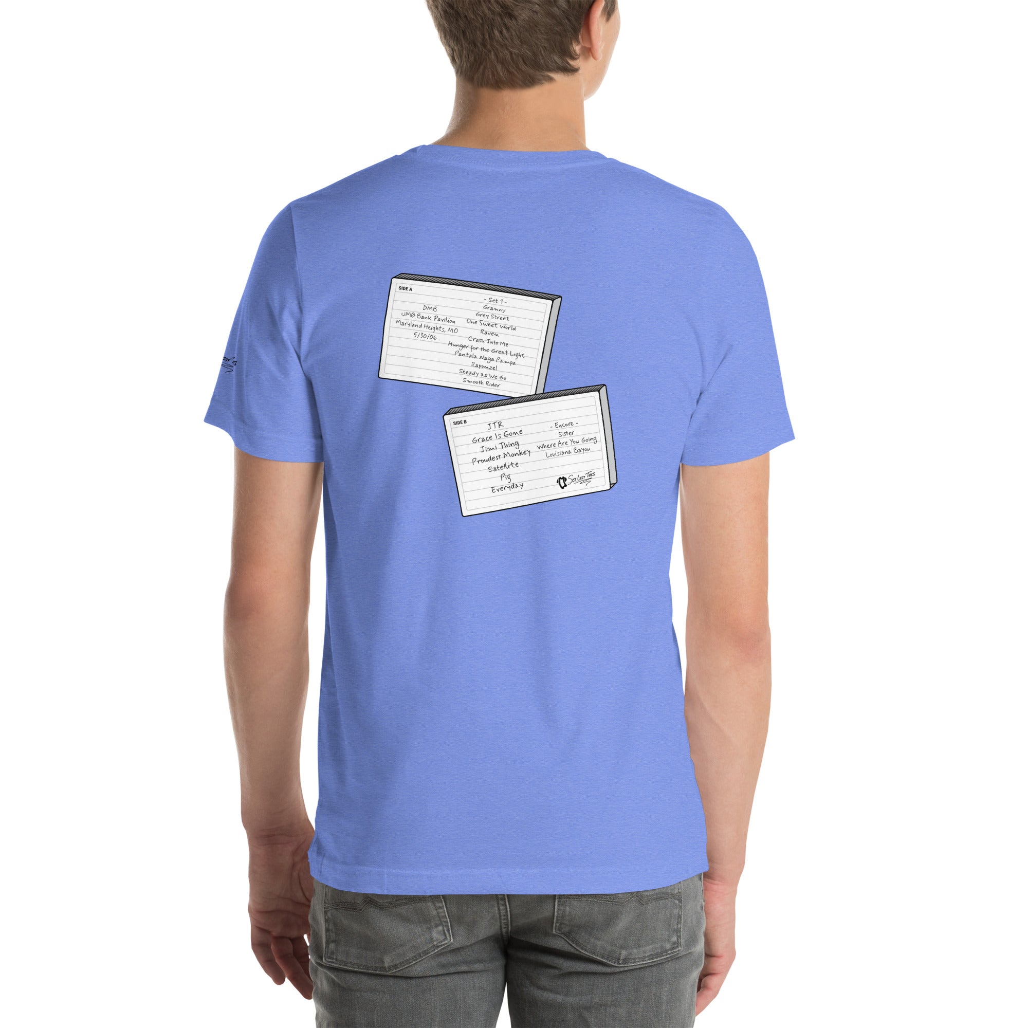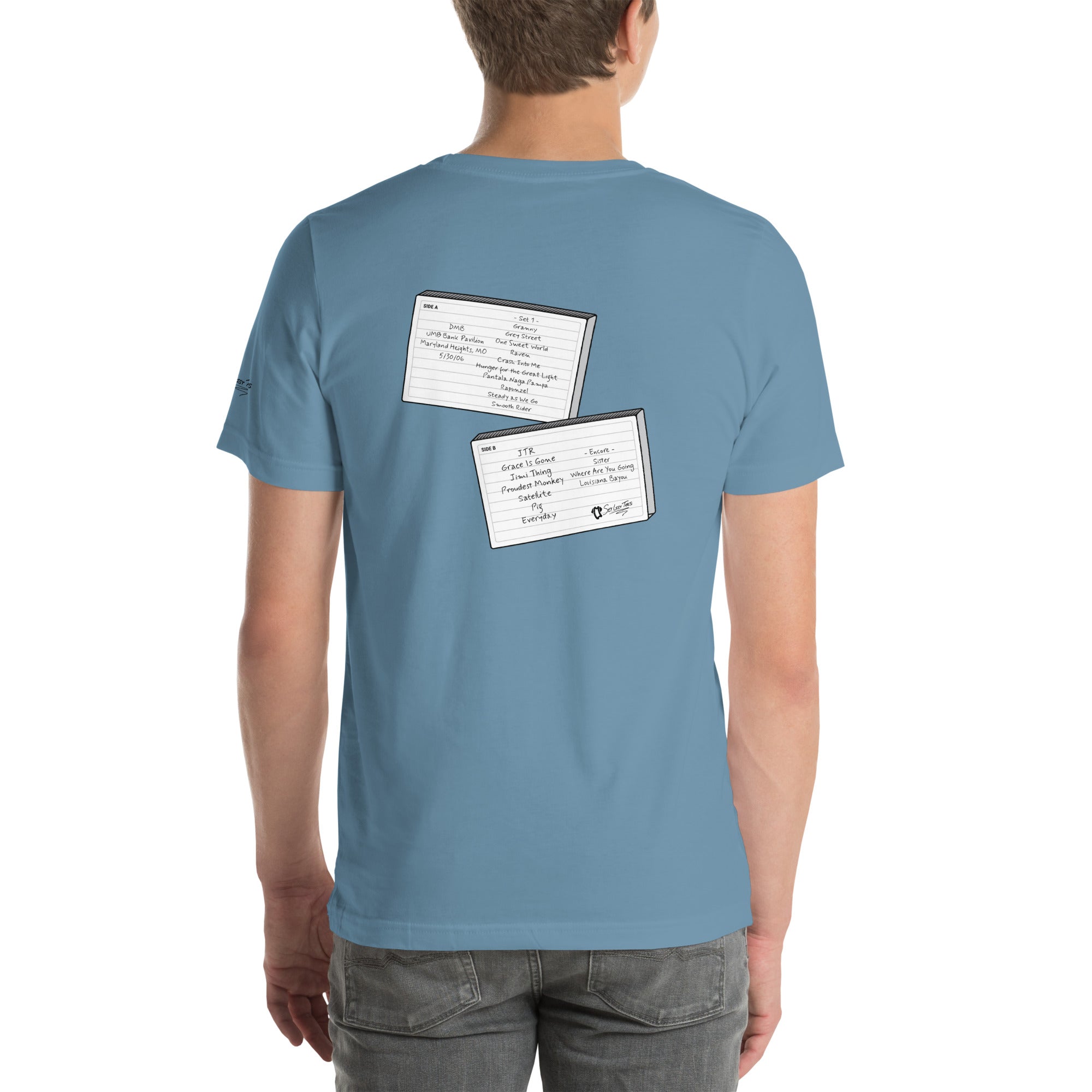 On the front, a vintage cassette illustration sits over the chest, just like the ones you’d label after a perfect show. Handwritten on the cassette’s white strip: