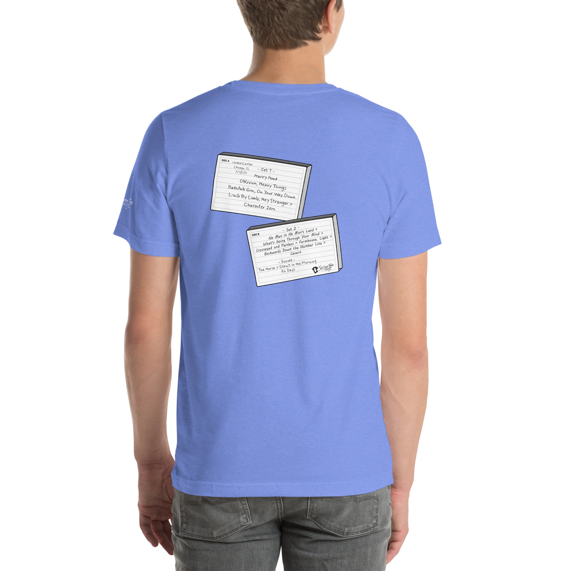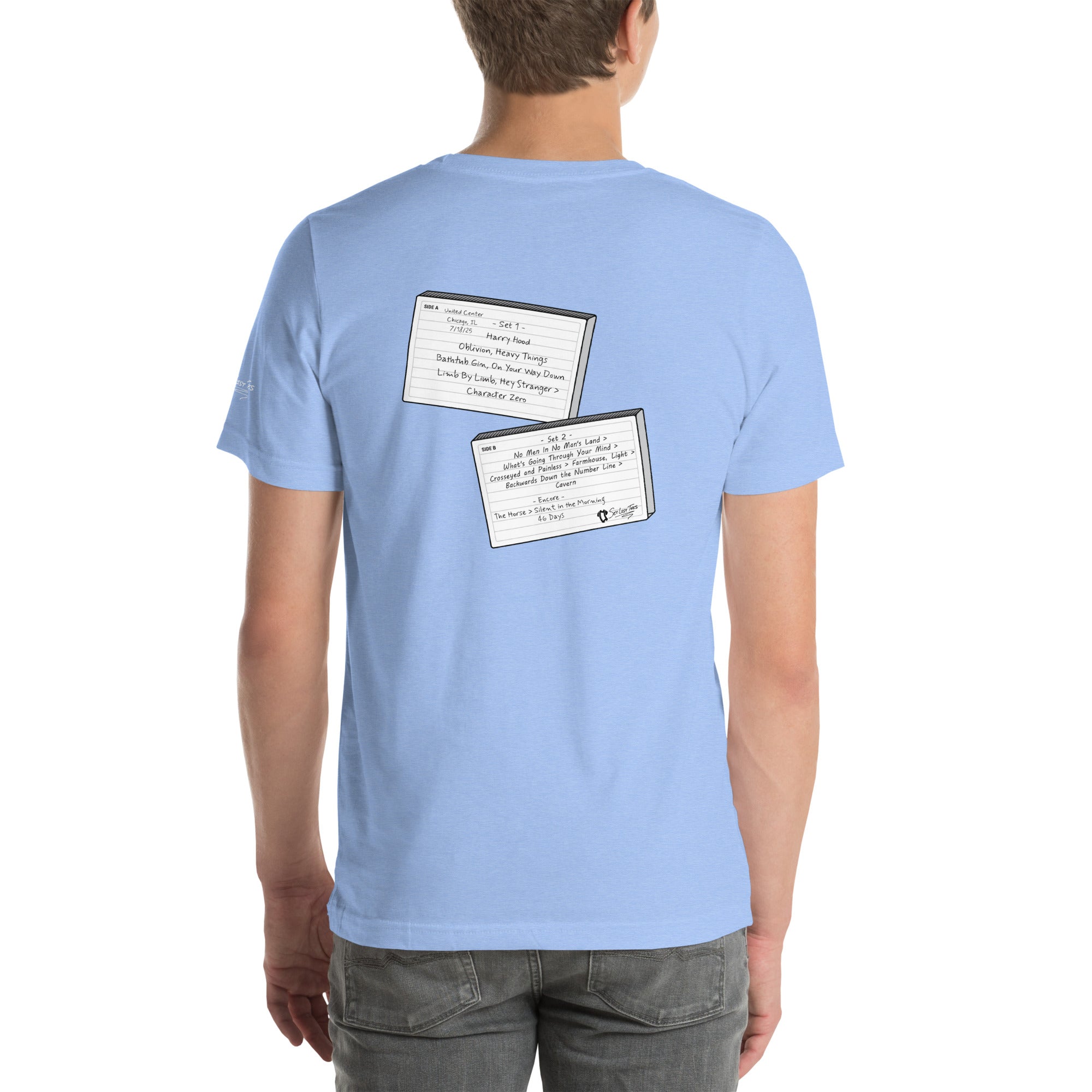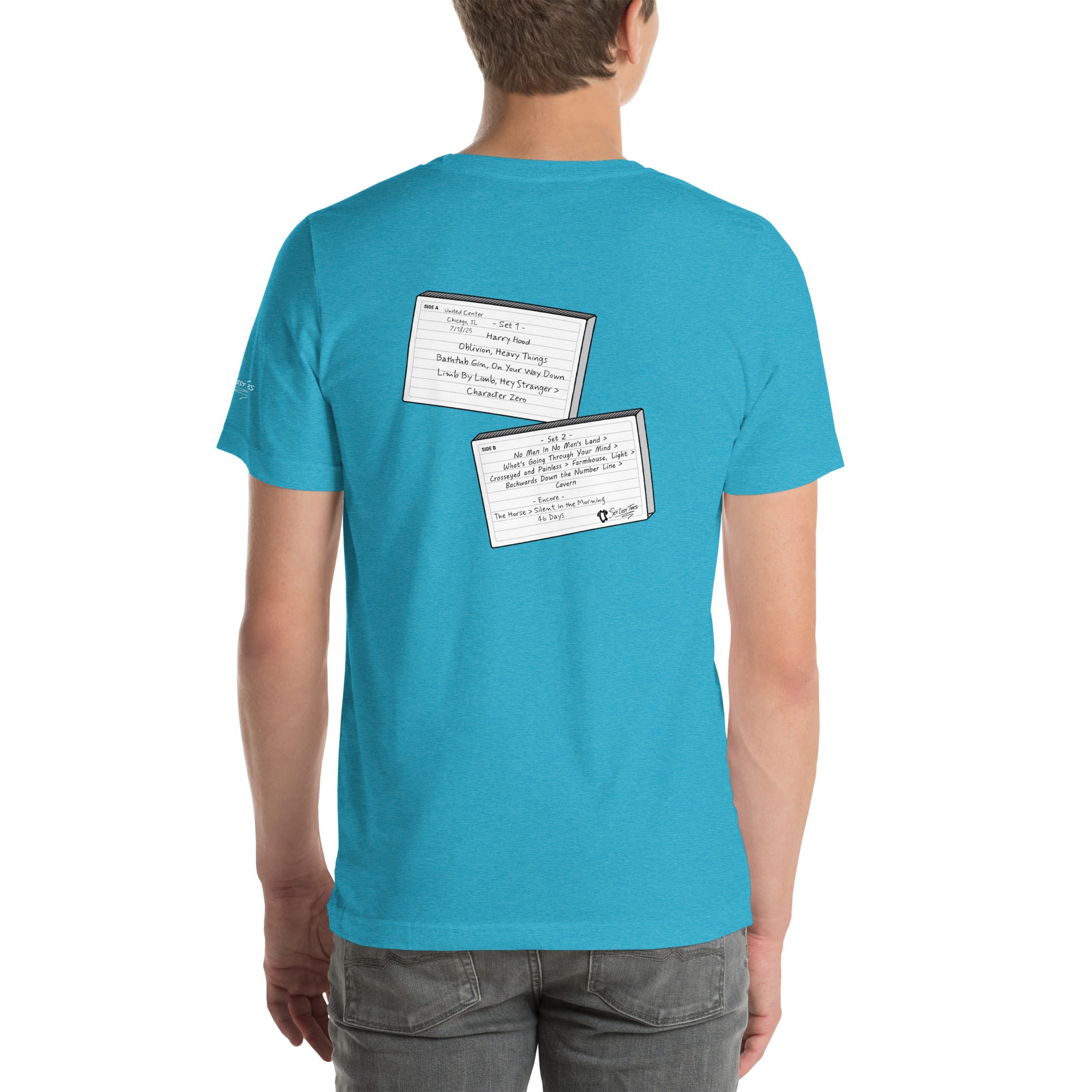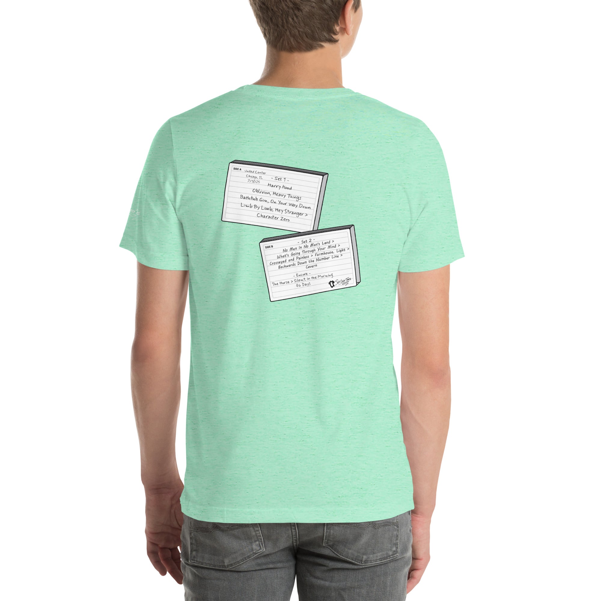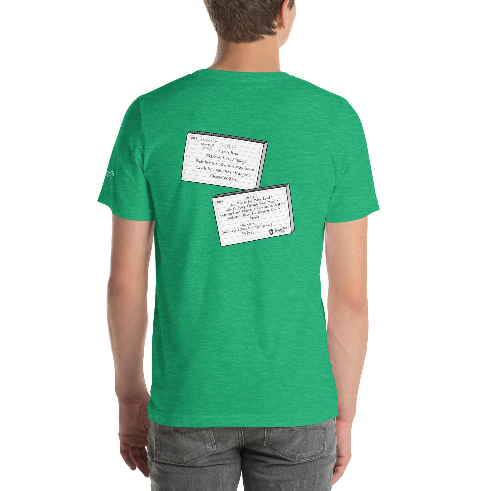 Flip the tee around and you’ll find the full setlist from the show rendered in bold letters on a graphic designed to look like a torn piece of notebook paper — the kind a fan might rip out of a journal to preserve every song before it faded from memory.
